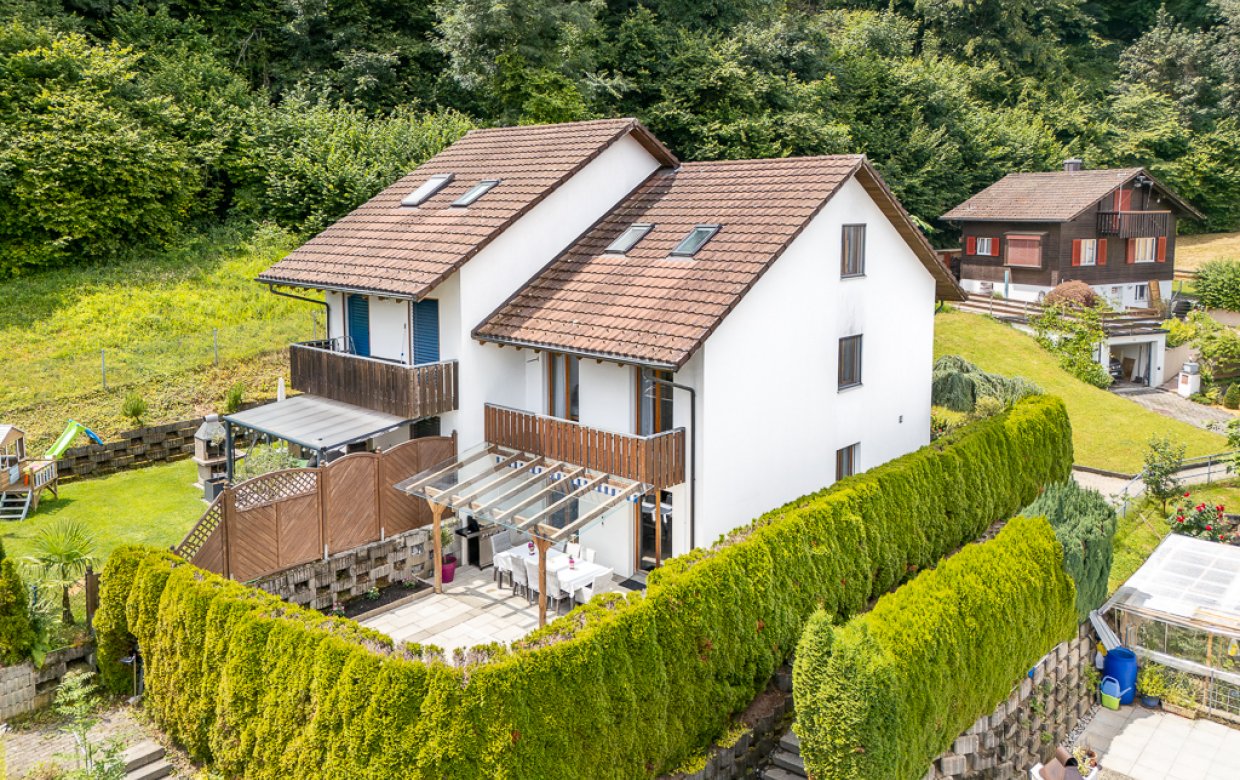 3.5-Zimmer- und 4.5-Zimmerwohnung mit 152 m² Wohnfläche,1'565 m² Grundstück, Garage, Gartenhaus, gepfelgtGrundstück über 900 m² Baulandreserve.Verkaufspreis CHF 1'250'000.-